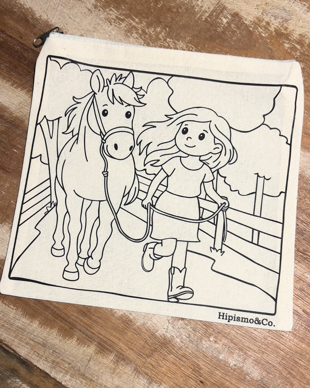 Produzida em algodão cru 20x20, com fechamento em zíper resistente, ela é prática para organizar seus itens do dia a dia e ainda mais especial porque já vem com um desenho na temática equestre impresso para você colorir e personalizar.